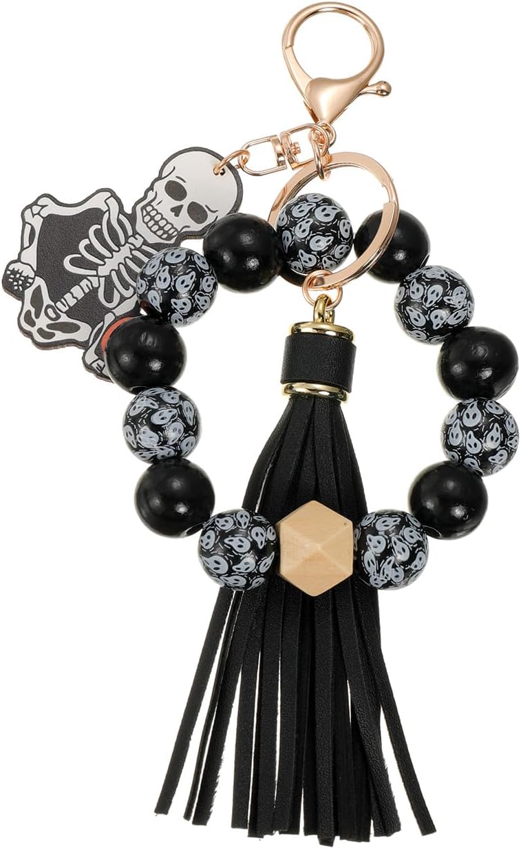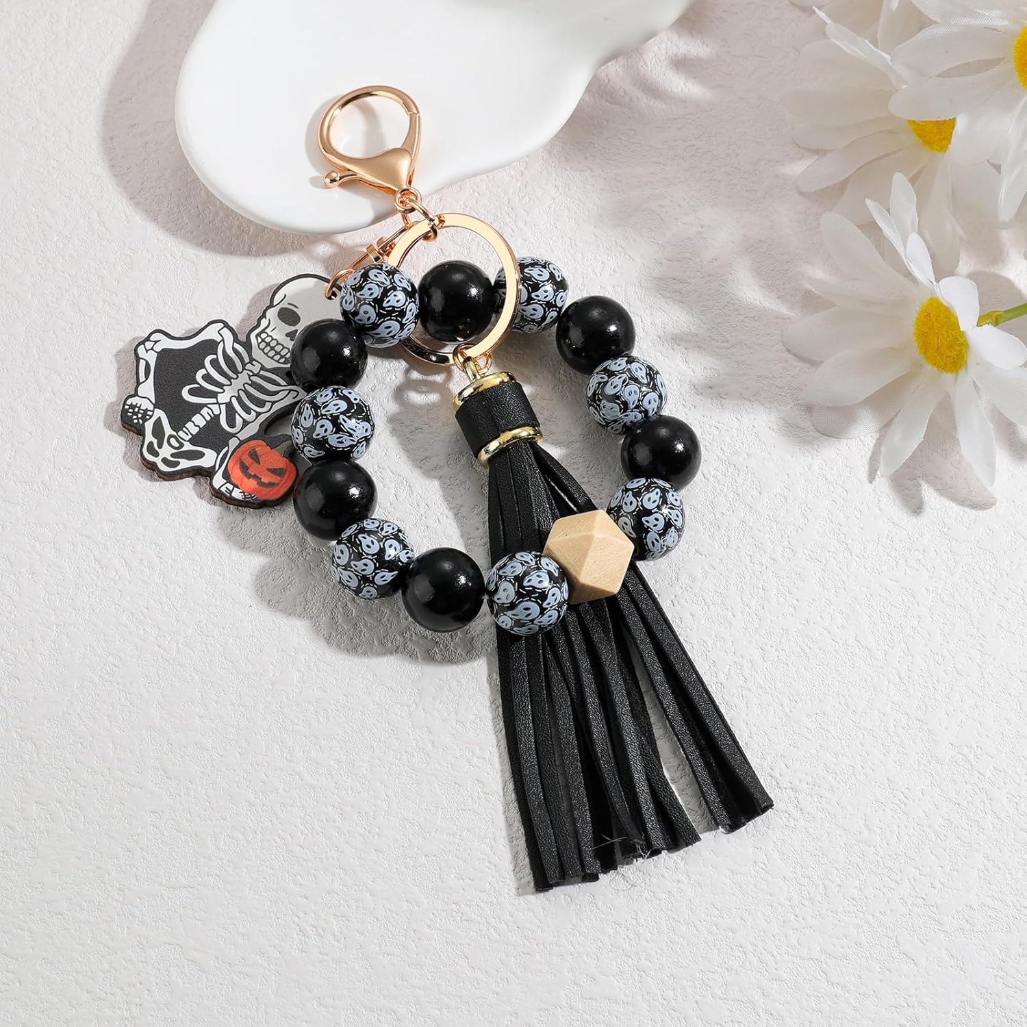Hand Made Black Bracelet Wristlet Halloween Wooden Beads Keychain with Tassel Elastic Keyring Bangle for Women